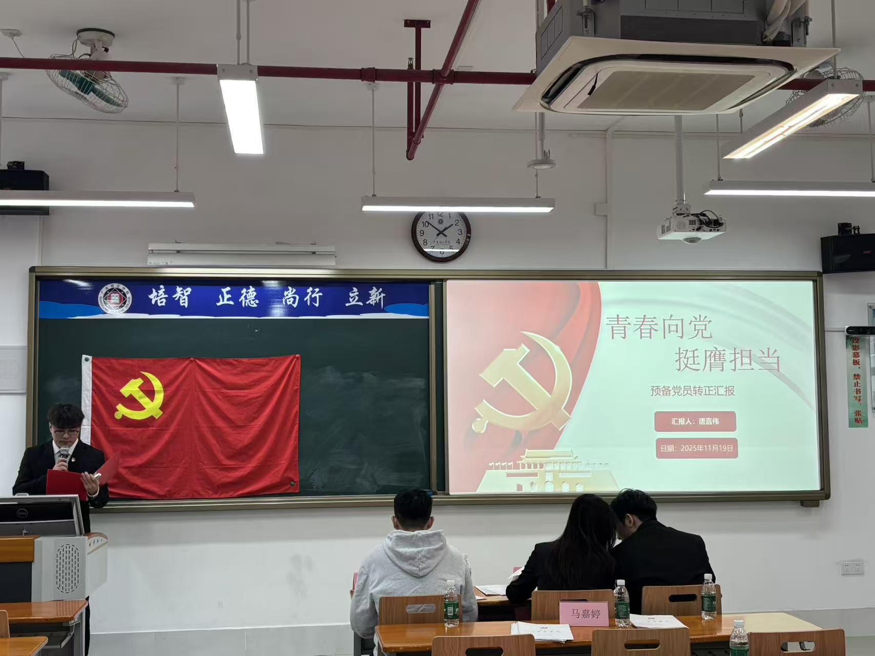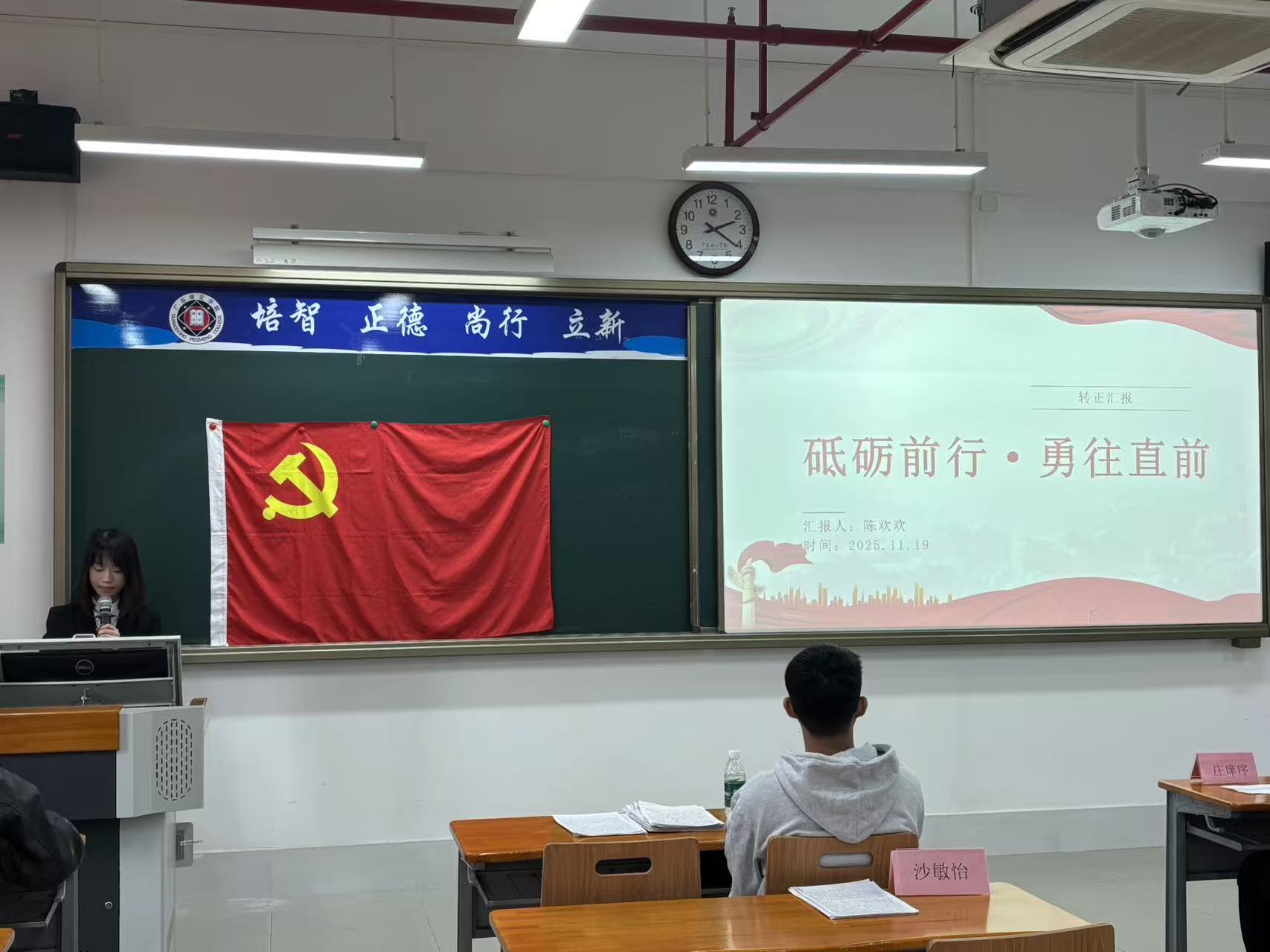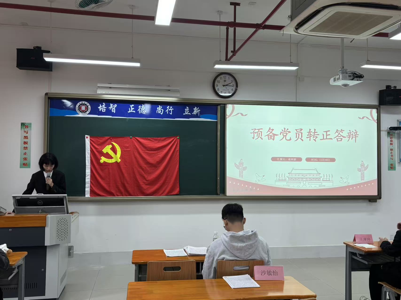 本网讯(数据科学与计算机学院党委学生第一党支部刘嘉嘉)为进一步加强党组织建设,壮大党员队伍,激发全体党员的使命感与责任感,2025年11月22日,数据科学与计算机学院党委学生第一党支部在第五教学楼404课室召开了2025-2026学年第一学期预备党员转正大会。本次大会旨在讨论并表决赵建文等11名同志的转正事宜。