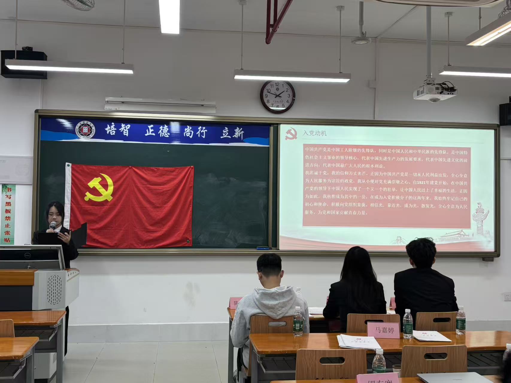 支部书记邓淑妍老师向顺利转正的党员表示祝贺,她寄语各位同志,要持续深入学习党的创新理论,始终牢记党员身份,坚定“听党话、跟党走”的政治信念。将党员的先进性融入专业学习和科研实践,主动投身志愿服务、社会实践等公益事业,在服务同学、奉献社会中践行初心使命,发挥党员先锋模范作用。