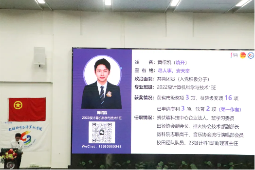 新时代大学生,是科创领域的新鲜血液,他们充满活力和创新精神,能够为科创带来新的思考方式和解决方案,提出新的假设和观点,为科创领域注入新的活力。为了推动学术交流和科研进步,让同学们了解到更多有关于科创的信息,在广东培正学院共青团委员会的指导下,广东培正学院数据科学与计算机学院共青团委员会于2024年4月18日晚19:00-21:00在第五教学楼108教室举办“尚行讲堂”之“助力大学科创团队发展”讲座。本次讲座的主讲嘉宾是来自22级计算机科学与技术1班的黄绍凯师兄。本次讲堂内容共分为团队选人、团队配置、团队管理、团队培养四大部分。讲解由浅及深,层层递进。
