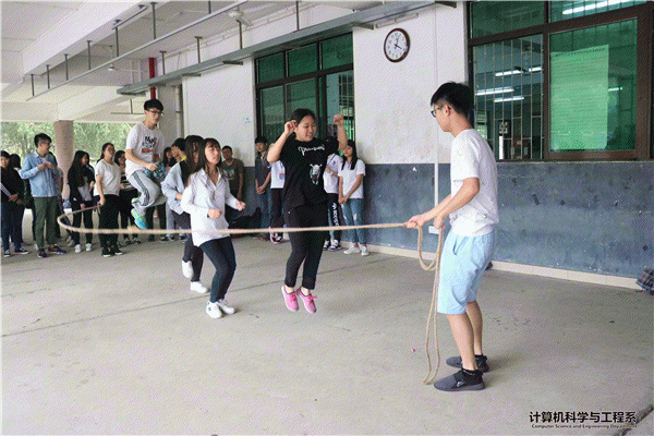 游戏规则:每个队伍有30秒的时间,其中两个人甩绳子,剩下的4个人依次跳绳,从第一个人开始跳开始计时,4个人都进入绳子开始计数,跳成功的数量不同则获得不同的积分。中途被绊倒若时间还不到30秒则可继续。0~10下积分为1分,10以上积分为2分。