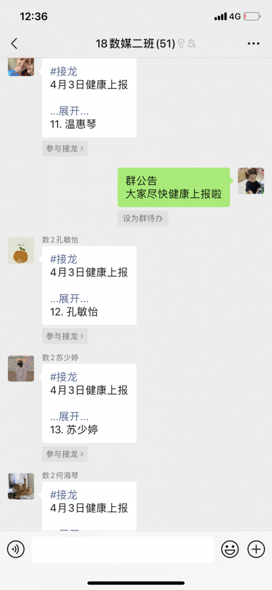 随着新冠疫情常态化管理以来,我班严格按照上级部门和学校的要求,做好自身的各项防护工作。另外,从开学至今,我和班委们坚持每天提醒班上同学按时上报健康信息。我深知,“打卡”不是目的,关心才是本意。通过每日进行班群接龙监督与日常提醒,我能够实时掌握同学们的动态及健康状况,以便能够为同学们提供更多更有针对性的帮助。