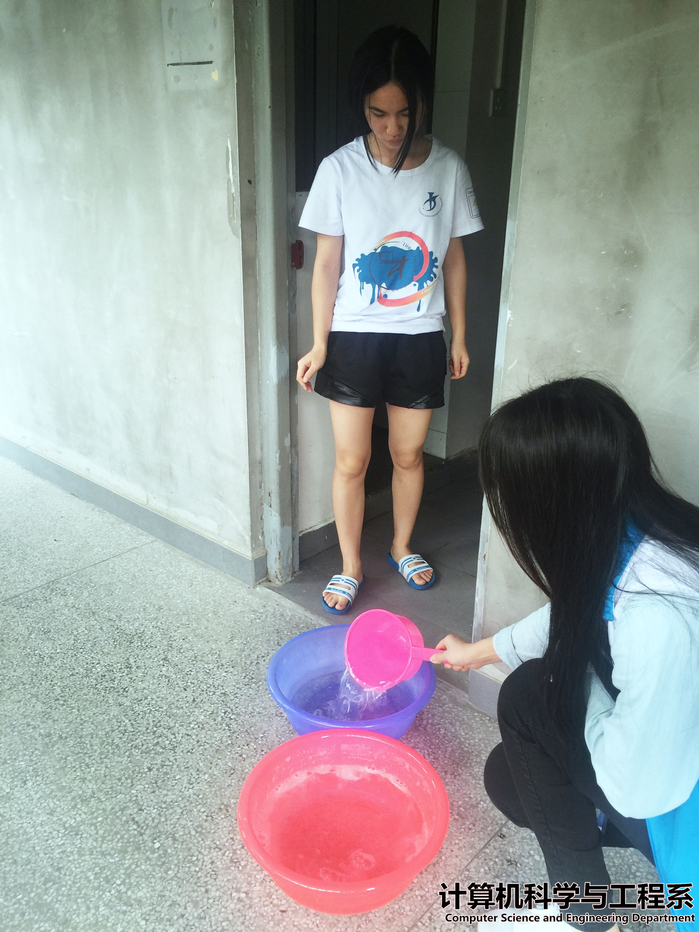 14点20分,我系团总支、学生会的成员和我系学生党支部成员到1栋、9栋、11栋、16栋、17栋、18栋、H栋和新教工D栋学生宿舍分发消毒水,他们提着装有消毒水的水桶并积极热情的为每间宿舍分发已调配好的消毒水,同时提醒同学们每日坚持领用消毒水,并做好宿舍卫生,防范诺如病毒。