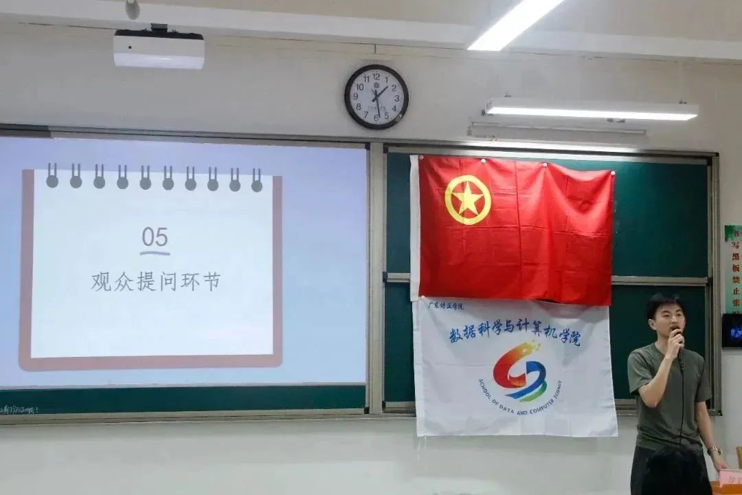 本次优秀学生分享会邀请了2020级数据科学与大数据技术1班的谢瑞彬师兄、2020级数字媒体技术2班的郑晓璇师姐。在现场工作人员的带领下,观众有序进入教室并签到;紧接着在主持人介绍活动的流程,本次优秀学生分享会正式开始。