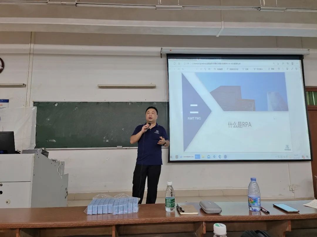 会议期间,李俊总经理通过简单易懂及紧密结合市场的方式向现场的同学们分享介绍了RPA+AI+BI在各个行业的实际工作场景中的应用等资讯方面的宣讲,同学们也积极的参与到互动问答及积极讨论等环节,现场气氛热烈,同学们也收获了企业提供的各式小礼品。