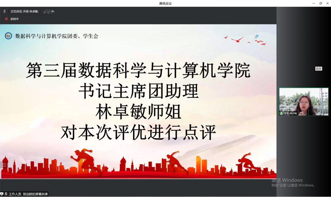 在各部门、队伍的精彩的答辩后,林卓敏师姐对本次评优进行点评:指出答辩中存在的问题、对表现优秀的部门、队伍作出表扬、希望各部门、队伍之间能够相互学习,通过借鉴学习结合自身实际情况去进一步的完善。表示评优的举办能够很好的让我们总结自己部门以及队伍上一年的工作。希望每个干部负责人都能够带领好自己部门、队伍的小伙伴一起进步成长,从而使数据科学与计算机学院更加团结,越来越好。