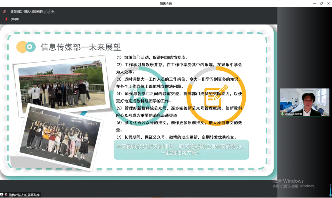 其次,他们对过往的工作内容进行回顾与总结。在答辩的末尾,各答辩人都对部门、队伍未来的发展作出规划。面对评委的提问,各位答辩人从容面对,条例清晰。虚心接受当前存在的问题与不足之处,想出合适的方案从而进行整改。