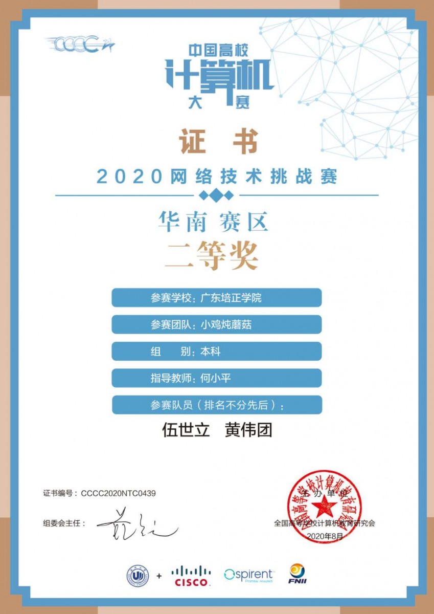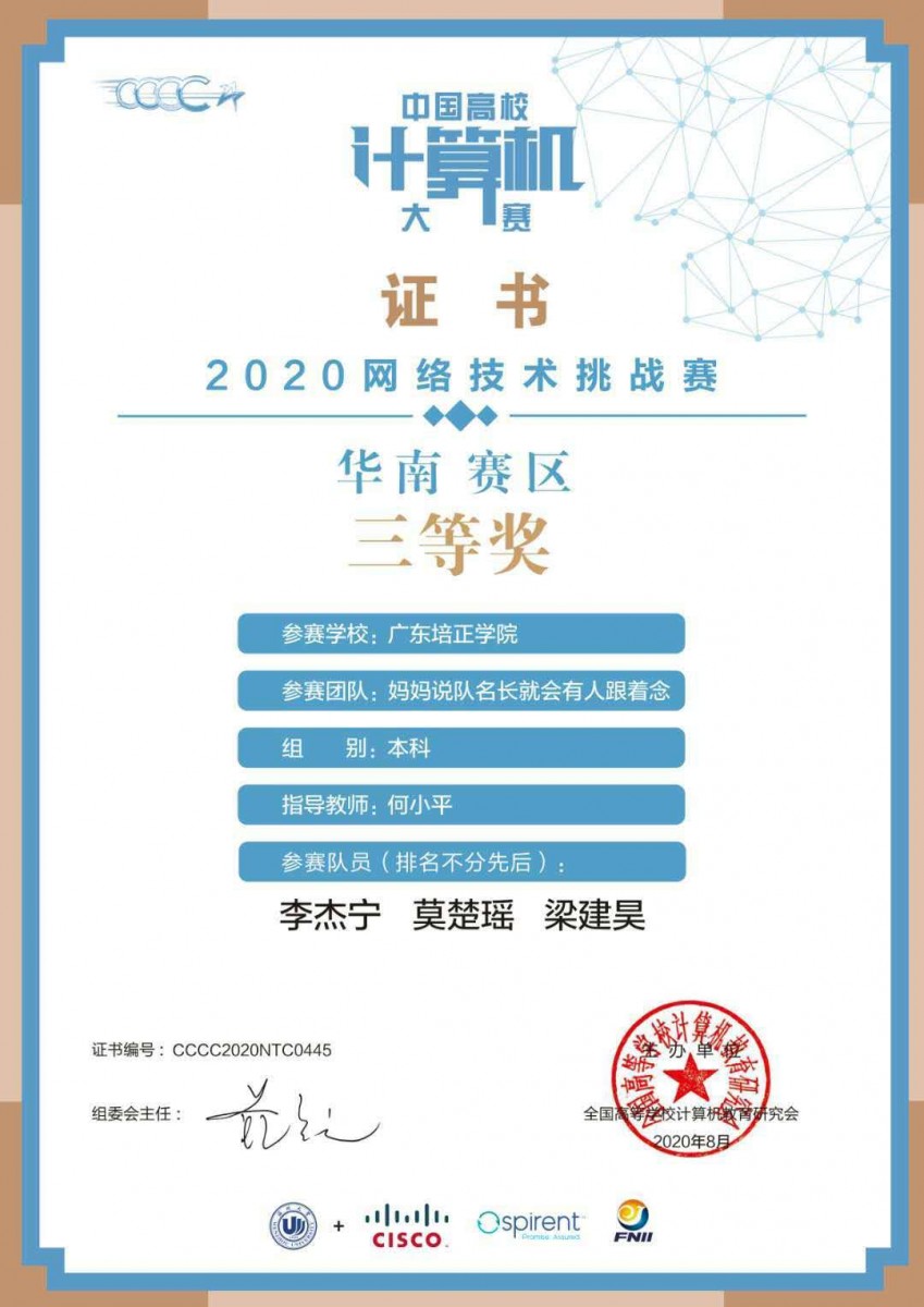 本网讯(数科院 何小平)近日,2020中国高校计算机大赛-网络技术挑战赛落下帷幕,我校2017级网络工程学子斩获华南赛区二等奖1项、三等奖2项。