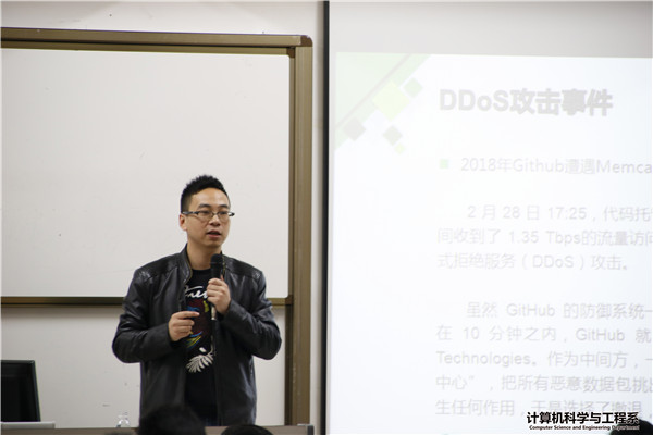 他为同学们详细地介绍了新时代下的安全事件和如何培养信息安全意识,还解析了DDoS的原理并举出了例子,并讲解了如何对DDoS防御。