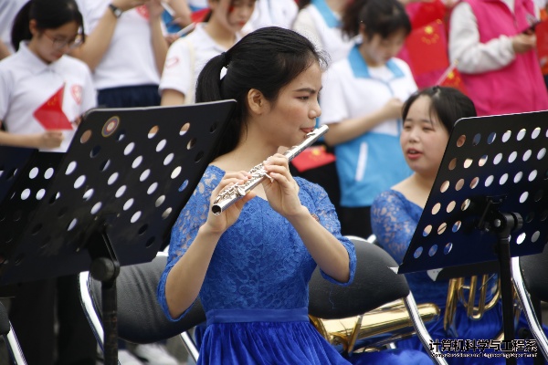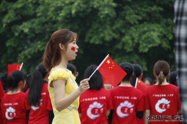 她们摇曳着手中的红旗高唱着《我和我的祖国》,嘹亮的歌声回荡在校园的上空……
