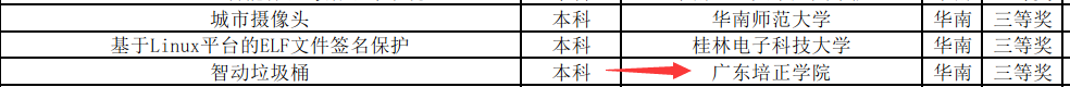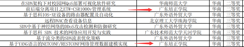 其中,伍世立、黄伟团团队的 《前后端分离项目之ETW-CSR1000v管理系统》在攻关(B-EP1)赛项中获得华南赛区二等奖,黄念恩、明演锋、刘美英团队的《智动垃圾桶》项目在创意(A)赛项中获得华南赛区三等奖,李杰宁、莫楚瑶、梁建昊团队的《基于YANG语言的NETCONF/RESTCONF网络管理数据建模实现》在攻关(B-EP1)赛项中获得华南赛区三等奖。